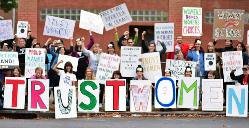 Pro-choice counterprotesters numbered some 60 at the height of the clinic defense. They held large letter signs spelling out the message "Trust Women" and wore patches sporting the same message. Other clinic defenders carried signs stating, "Abortion is health care. Health care is a right" and "My body, my choice."
